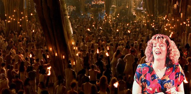 Key Scene: Mary Magdalene (Imelda Staunton) climbs up on a ladder to offer Jesus a sip from her Thermos.