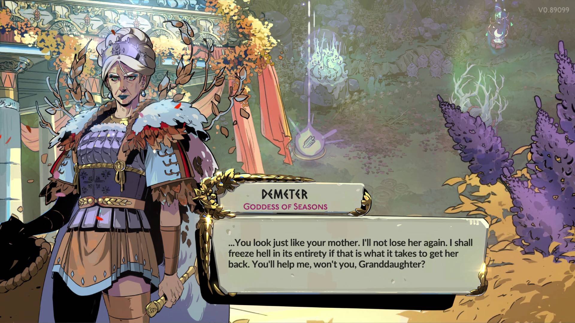 - Demeter, Goddess of Seasons: Demeter is the mother of Persephone and grandmother of Melinoe. She provides wintry Boons that can inflict Freeze on enemies, create Cyclones, and more.