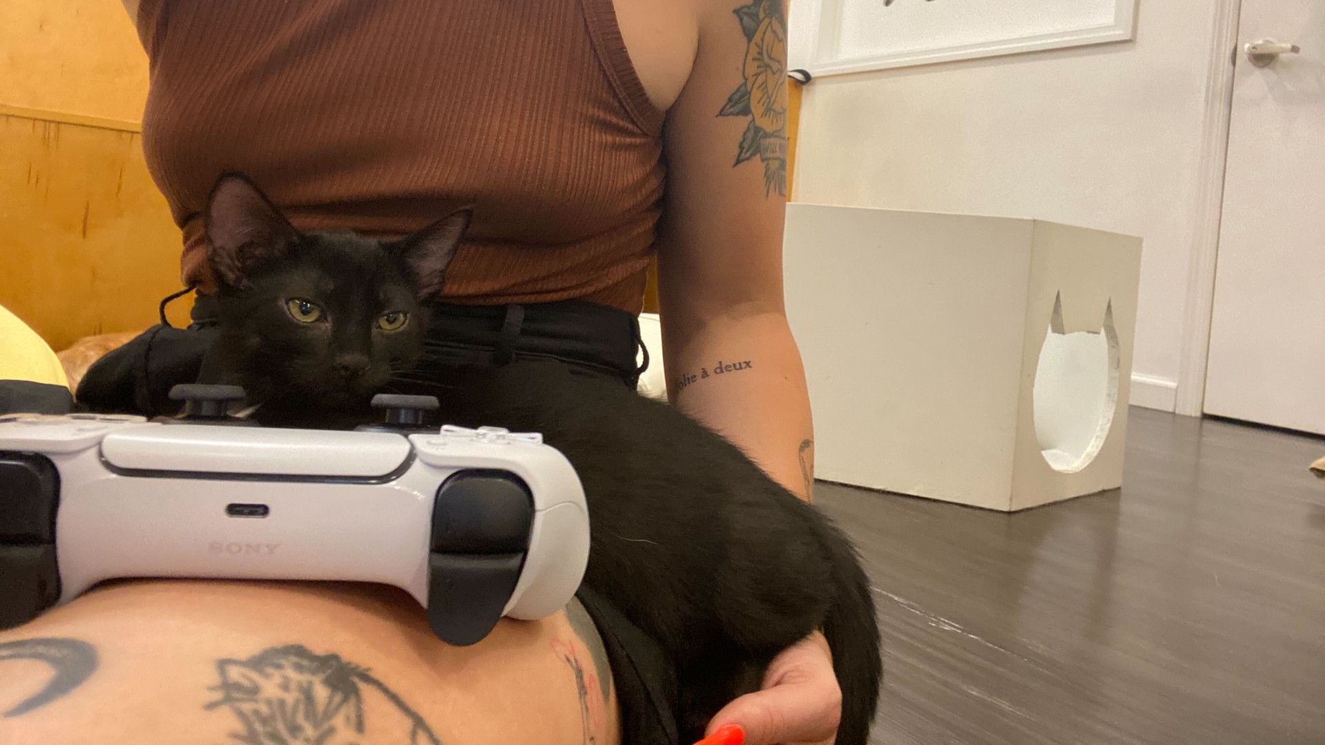 All of these kittens clearly want attention. If both of my hands are occupied with a controller then they aren't getting pets, so they're quick to frustratingly meow or rub on me whenever I try to focus on Stray. Realizing I want to pet more cats, I hand the controller to another person at the cafe, hoping they'll be better at paying attention to the game and I can play via osmosis. I help them with some of the puzzles, absentmindedly rocking Charlie in my arms before I realize that this is the perfect opportunity to get a Cats Watching Stray moment. I ask the person playing to press the circle on the DualSense controller (which makes the Stray cat meow as much as you'd like), hoping the kittens would react. But apparently, when your every day is filled with meows, hisses, and jingly toys, you're a bit desensitized to cat sounds, because not a single one of them even blinks at the meowing ginger cat.