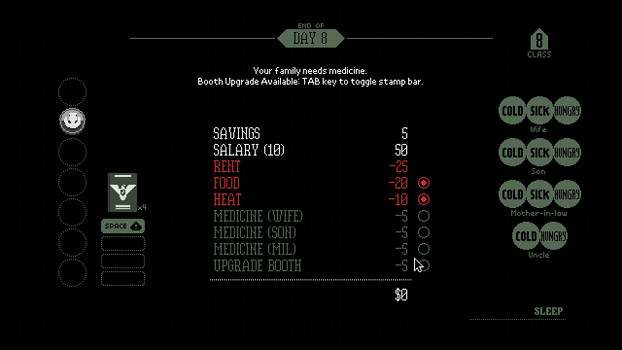 "As the family's lone breadwinner, it's up to you to determine where to spend the meager earnings from your backbreaking labor at the border checkpoint. Heat, electricity, it all adds up so fast - does Junior really need those damned expensive pills? Decide for yourself!"