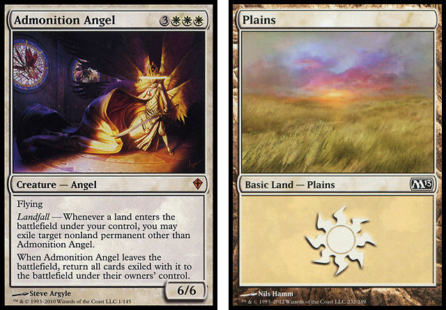 Admonition Angel is just a sweet, sweet card. Even if it was just a 6/6 flyer for six mana, it'd still be amazing--but its Landfall ability makes this Angel that much more potent. Each time you play a land, Admonition Angel will exile any nonland permanent of your choosing--meaning you can methodically snuff out your opponent's best cards or any that are currently threatening your life total. But the fact that this powerful creature is in your deck presents an interesting situation--you actually have a reason to withhold land cards in your hand once you hit six or seven mana. That way, you can consistently trigger the Angel's ability once you get her into play.