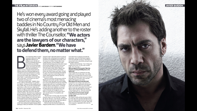 He's won every award going and played two of cinemas most menacing baddies in No Country For Old Men and Skyfall . He's adding another to the roster with thriller The Counsellor . "We actors are the lawyers of our characters. We have to defend them, no matter what." Read his extensive Total Film Interview for the full story of Bardem's career...