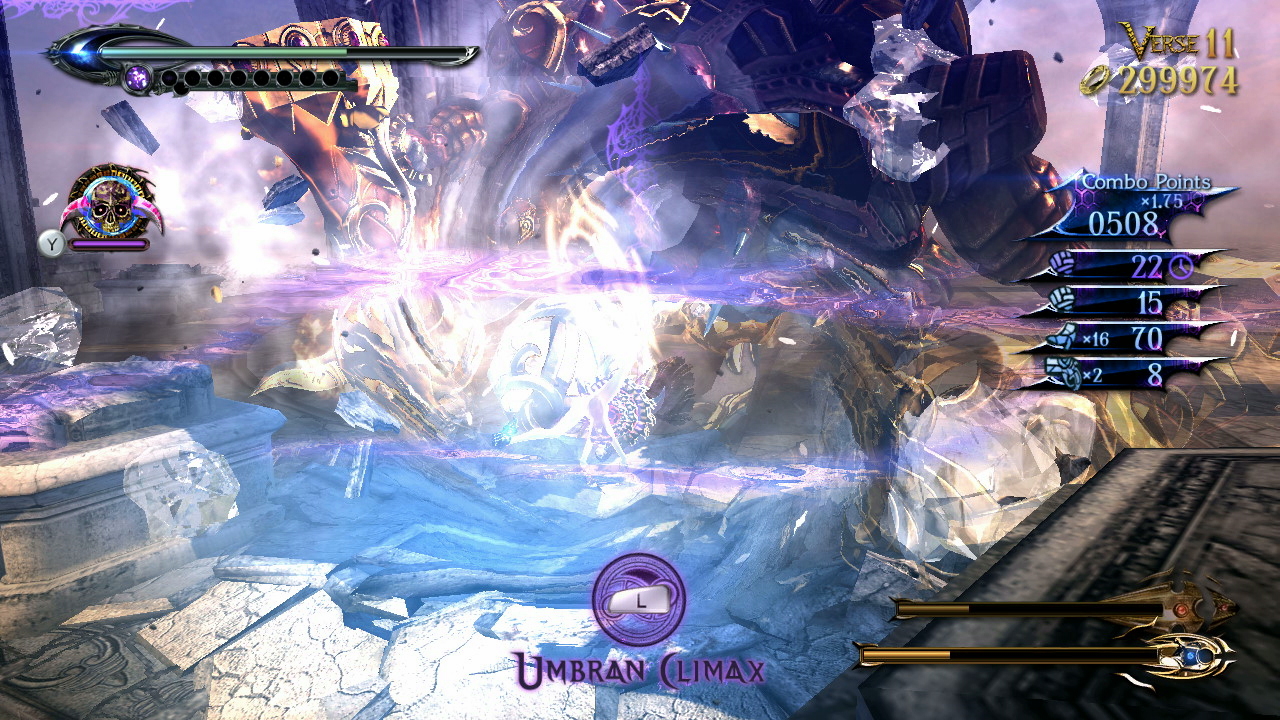 Once your magic gauge is filled up sufficiently, you get a button prompt on the screen alerting you to the fact that the Umbran Climax state is ready for use. While it's fun (and devastating) throwing around wicked weave moves instantly for a few seconds, it's actually better sometimes to save your magic instead for torture moves. As with the original, sometimes you'll get a prompt asking you to press X and A simultaneously to trigger a Torture Attack. These range from a MadWorld-style spiked mangle to some kind of pulley-death contraption suspended above the ground. Any of these can see off even powerful low-tier enemies on one go, and you're invincible while the attack animation plays out. Definitely worth considering.