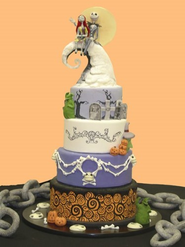 It transposes Tim Burton's entire production design into a five-layered labour of love... Chocolatey-orange base, beautifully adorned, porcelain-like fondant top layers and a glorious curly, ice-creamy top for Jack Skellington and rag-doll missus Sally.