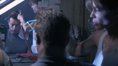 Obviously Linda Hamilton didn’t cut a hole in Arnie’s head and take out his microchip (although it might explain a few things…), but the use of old-school practical effects in the scene is just as clever as the CG trickery in the rest of the film. With a model of the back Schwarzenegger’s head in the foreground, and a window standing in place of the mirror, the real Schwarzenegger plays his own reflection (and Linda’s twin sister Leslie doubles for her “reflected” hands).