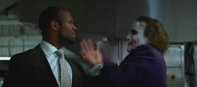 The Death: As an irate henchman approaches him, The Joker (Heath Ledger) performs an impromptu magic trick in which he makes a pencil disappear… right into the first chap’s cranium. Ta-Da!
