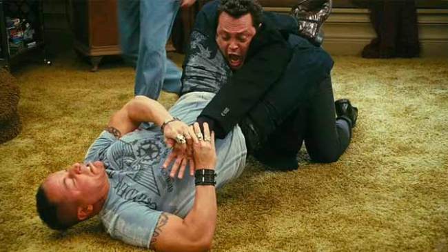 The Dark Moment: Failing in their attempt to get away for Christmas, Brad (Vince Vaughn) and Kate (Reese Witherspoon) are forced to visit Brad's dad (Robert Duvall), where Pop and his other sons (Tim McGraw, Jon Favreau) delight in humiliating Brad with a display on on-the-floor cage wrestling.
