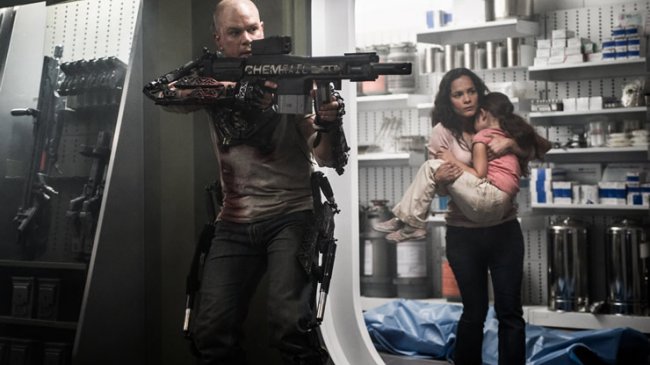 The Fight Scene: Mercenary Kruger (Sharlto Copley) has been repaired after having his face blown up, and now he's on the rampage, going after a dying Max Da Costa (Matt Damon) on Elysium.
