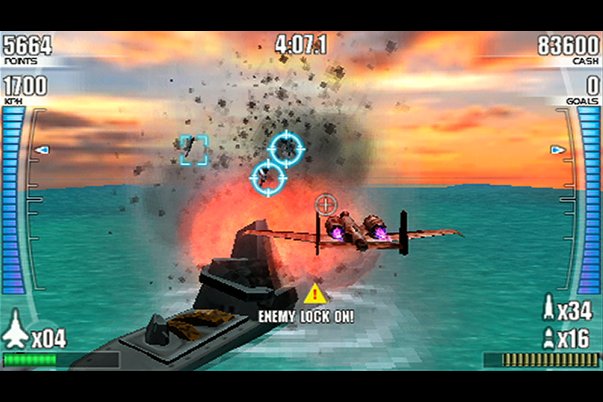 The possibilities don't stop there, either. If you want to divide up the targets in a level, for example, one player can pick a bomber and murder whatever's on the ground, while the other takes a fighter and clears out the skies. To ensure that players in different jet classes can keep up with each other, the game will automatically adjust your speeds, making the slower player a little faster and the faster one a little slower.