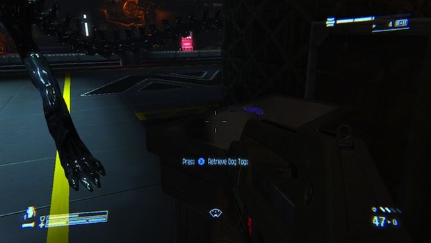 Found during the ‘Retrieve The Sulaco Flight Recorder’ objective. When the first pack of xenomorphs attack, head right toward the catwalk. The dog tag for Cpl. Dwayne Hicks is sitting on a crate.