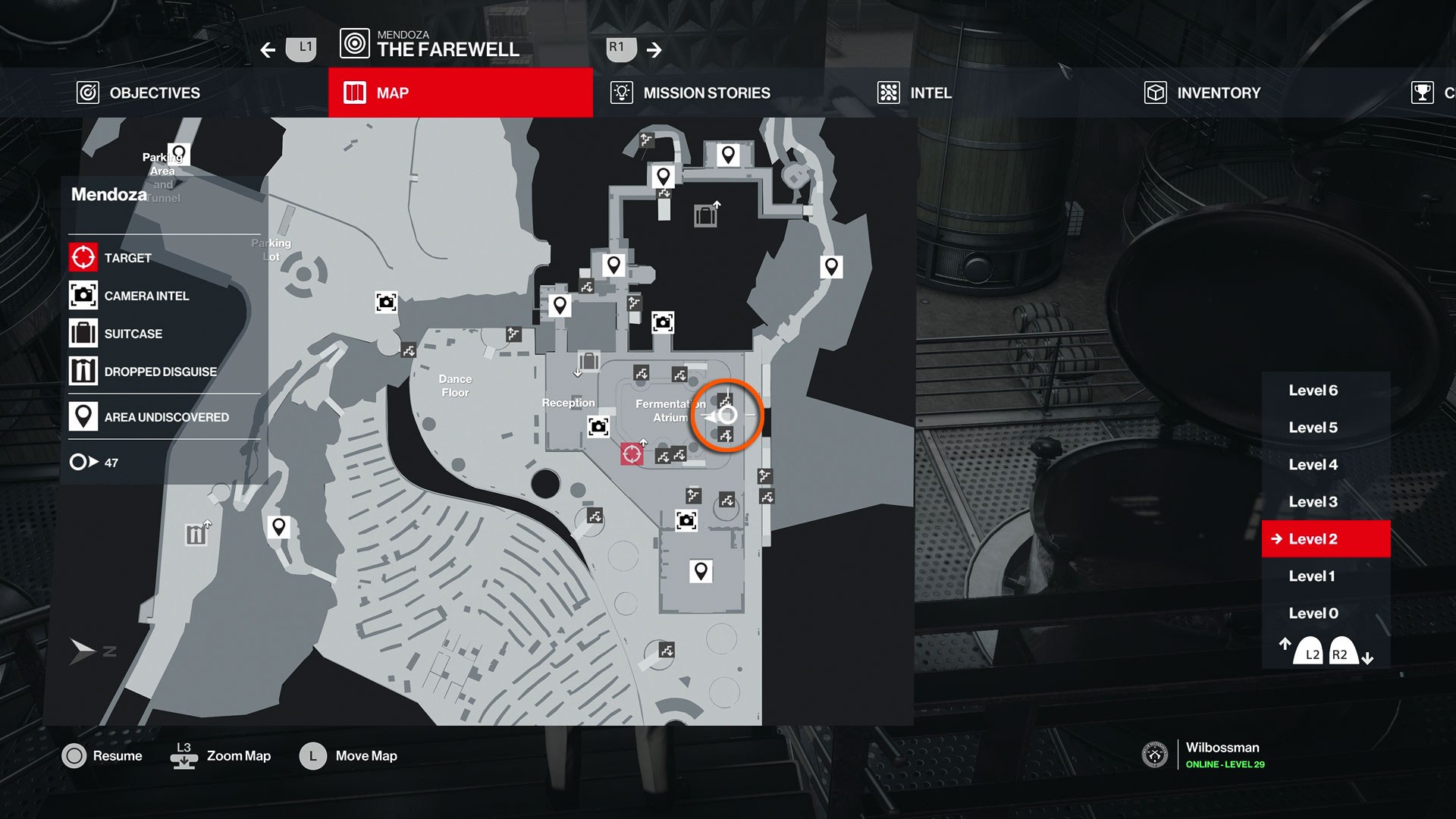 Go over the Dance Floor and through Reception to the far side of the Fermentation Atrium, then eavesdrop on the conversation between the two Workers about overflowing tanks. You'll need to be disguised as a Worker or Gaucho to follow the Senior Worker and continue the next part of the Mission Story relatively unchallenged.
