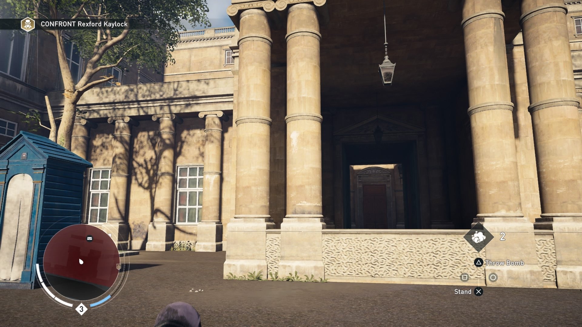 You can enter the area across the road from Green Park. Hop onto the roof of the smaller building next to the fence, with the blue guard huts at its centre.