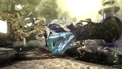 Crazy enough? Let’s move on to her guns: four in total, two in her hands and two strapped to her feet. Their names are Parsley, Sage, Rosemary and Thyme; collectively, they’re called Scarborough Fair. Does she blow holes in the door when tying up her bootlaces? Surely she must. If it sounds like Devil May Cry to the power of infinity, there’s a reason. One of the first games from Japanese “super-group” developer Platinum Games, Bayonetta is the work of Hideki Kamiya, the man behind the original DMC. He’s moved on to other things since, notably Viewtiful Joe and Okami, leaving Dante to fight his own battles. This game, then, could be seen as an alternative take on DMC2: a faster, sexier, more intense version of the first game’s bullet ballet.