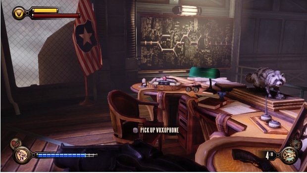 After confronting Comstock, head up the right staircase and enter the first door you come to. This is Comstock's office. In here, a Voxophone sits on his desk.