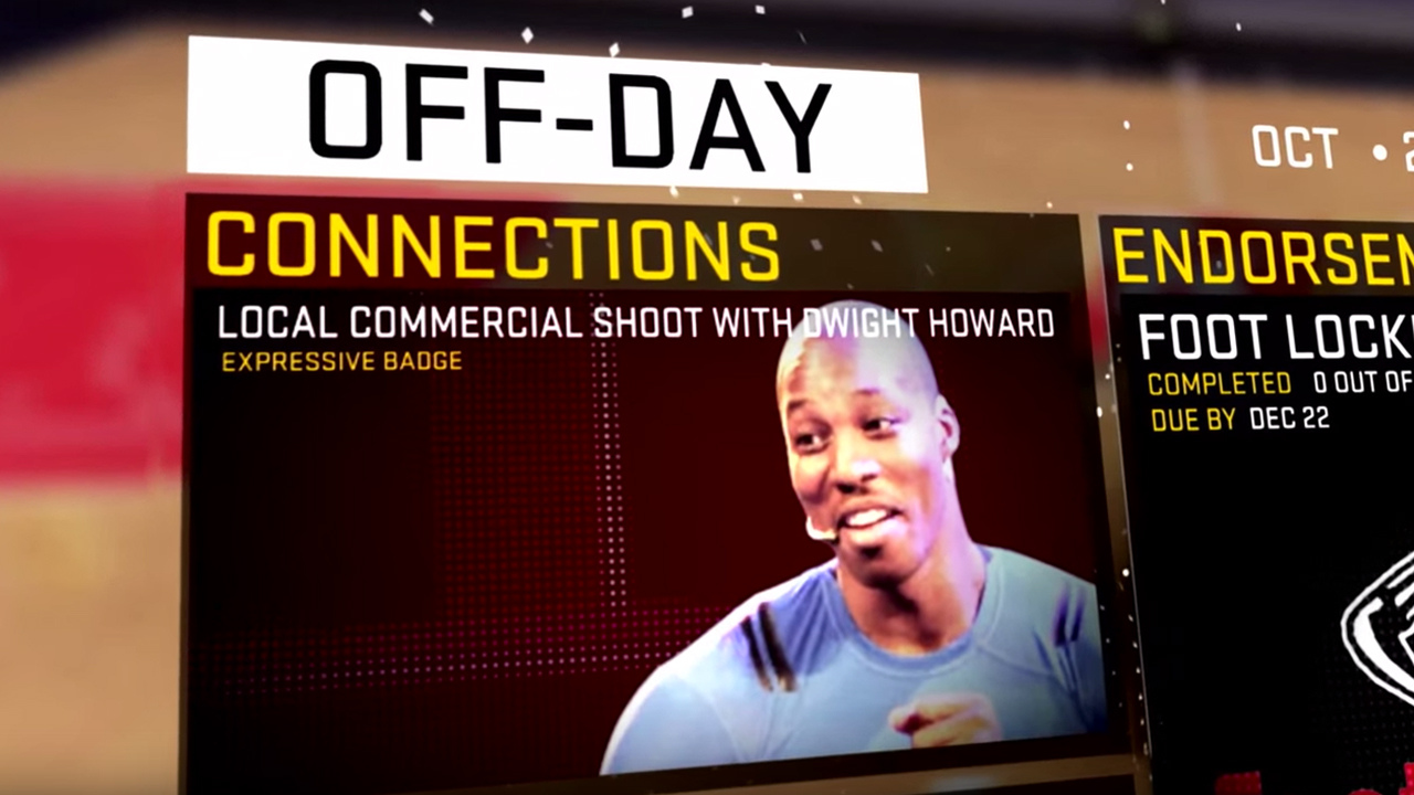 A new addition to the series-standard MyCareer mode, Off Days lets you decide how your character is going to spend the 80 days that fall between games, giving you the option to ramp up their career even when they're nowhere near a court. Your down-time options fall into three different categories - live practice, connections, and endorsements. On any given Off Day, you can choose to hit the practice gym, meet and make new connections with people in the business, or make sponsorship deals and improve your visibility.