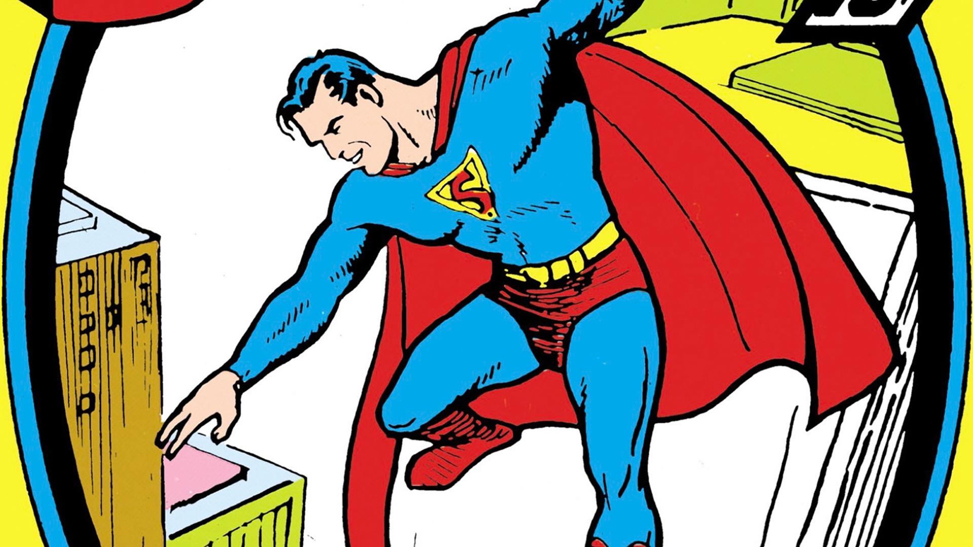 Superman soaring over Metropolis on the cover of 1939's Superman #1
