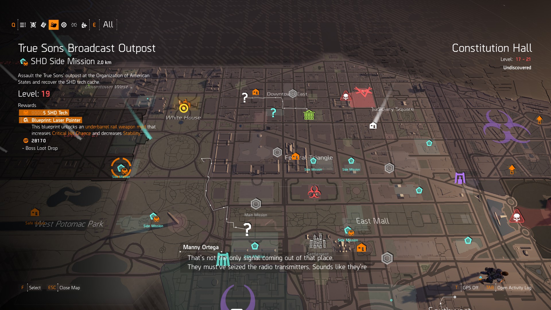 Another method is through side missions. Open up your map of Washington D.C and you should see a number of side missions dotted around the map. They’re the blue pentagons which may or may not have an SHD symbol attached. Simply click on them to check if the rewards constitute a blueprint for a Division 2 weapon mod. In most cases they do. It’s usually just main missions which don’t reward the player with mods. However, these are just blueprints for weapon mods, and you need to know how to craft them now you’ve unlocked them.