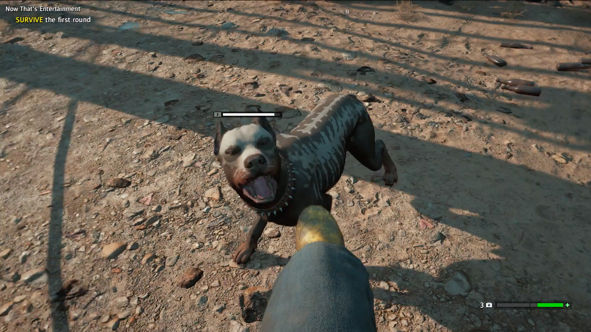 A little later on in the story there's also a mission where you're literally forced to engage in even more dog cruelty. A man called Irwin Smalls send you off on a mission entitled "Now That's Entertainment", which might sound like fun, but actually involves you being stripped of your weapons, and sent into an arena where you must fight to the death with your fists or any kind of melee weapon that you can find lying around. And the first wave of enemies, yes, you guessed it: Dogs. You literally have to punch and kick, and later beat with a stick, dogs to death in order to progress. Someone call the post-apocalyptic PETA.