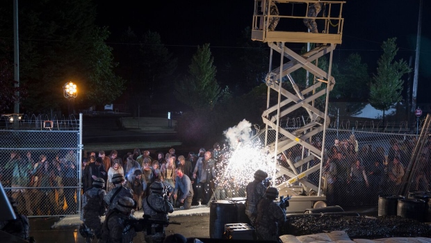 So, the family try to rescue Nick from the National Guard. They do so by making use of the zombie horde that the soldier boys have locked up in the arena (there’s heavily telegraphed irony for ya). It all leads to the show’s biggest action scene to date, with a mass walker onslaught that's reasonably exciting but, as with a lot of this show, very familiar. The season needed a big set piece in its finale, and this satisfies that, but feels too routine to truly thrill.