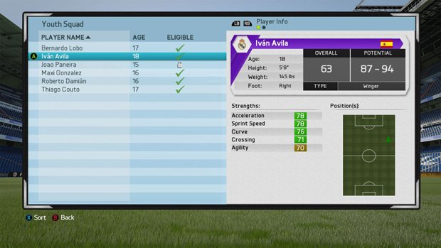 When players first appear on your scouting reports, they will have two stat ranges - Overall and Potential. The former refers to how good the player currently is, while the latter predicts how good he will eventually become. When deciding whether to sign a player to your youth academy, you should focus on potential - a player with a low overall (OVR) but a high potential will rapidly improve thanks to his strong future ability, whereas a player in the opposite situation will likely start out strong but quickly stall.