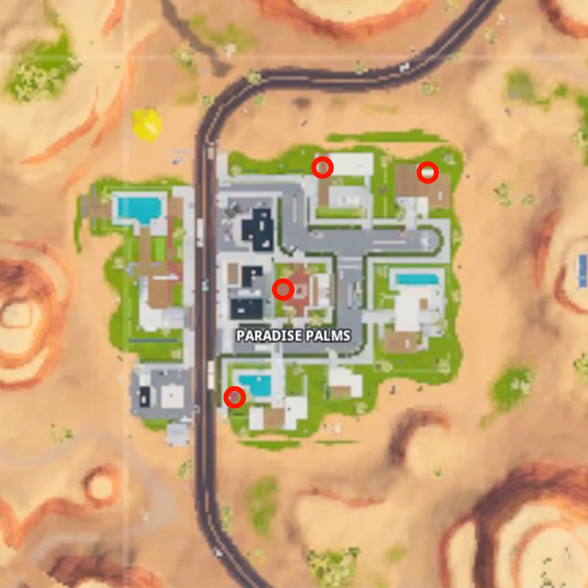 In Paradise Palms, there's four Fortnite grills to be found, so we've highlighted each of the locations specifically on the map above. There'll undoubtedly be multiple players destroying them alongside you, so try making a beeline throughout the town to get all four as quickly as possible.