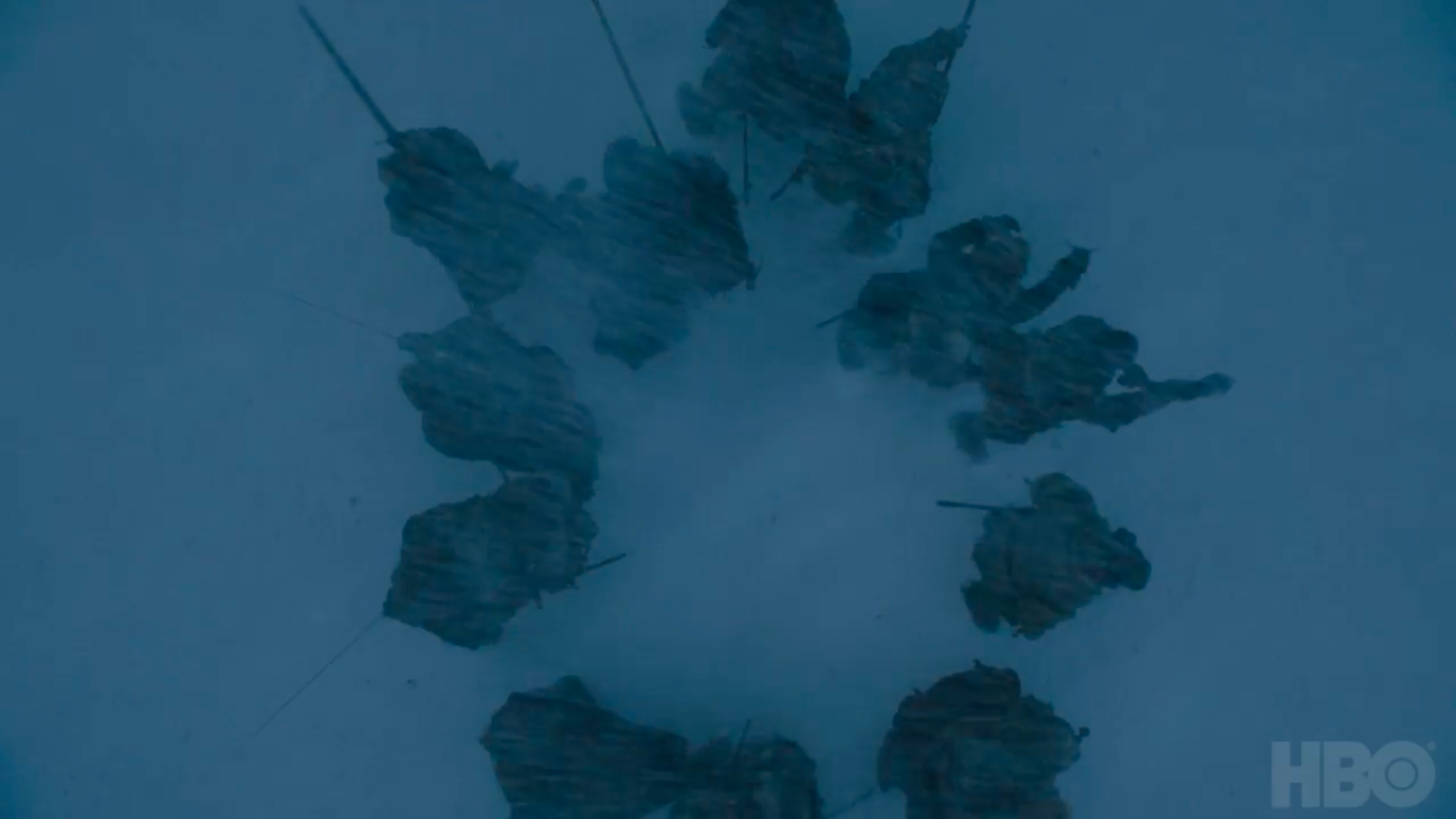 What's this? The party that left The Wall are getting attacked? Shocking. Ok, who is in this party? The different weapons held by each person suggests it's either a bunch of Wildlings or perhaps a mixture of Wildlings and Rangers from Castle Black. Read on, and we'll confirm exactly who is in this group.