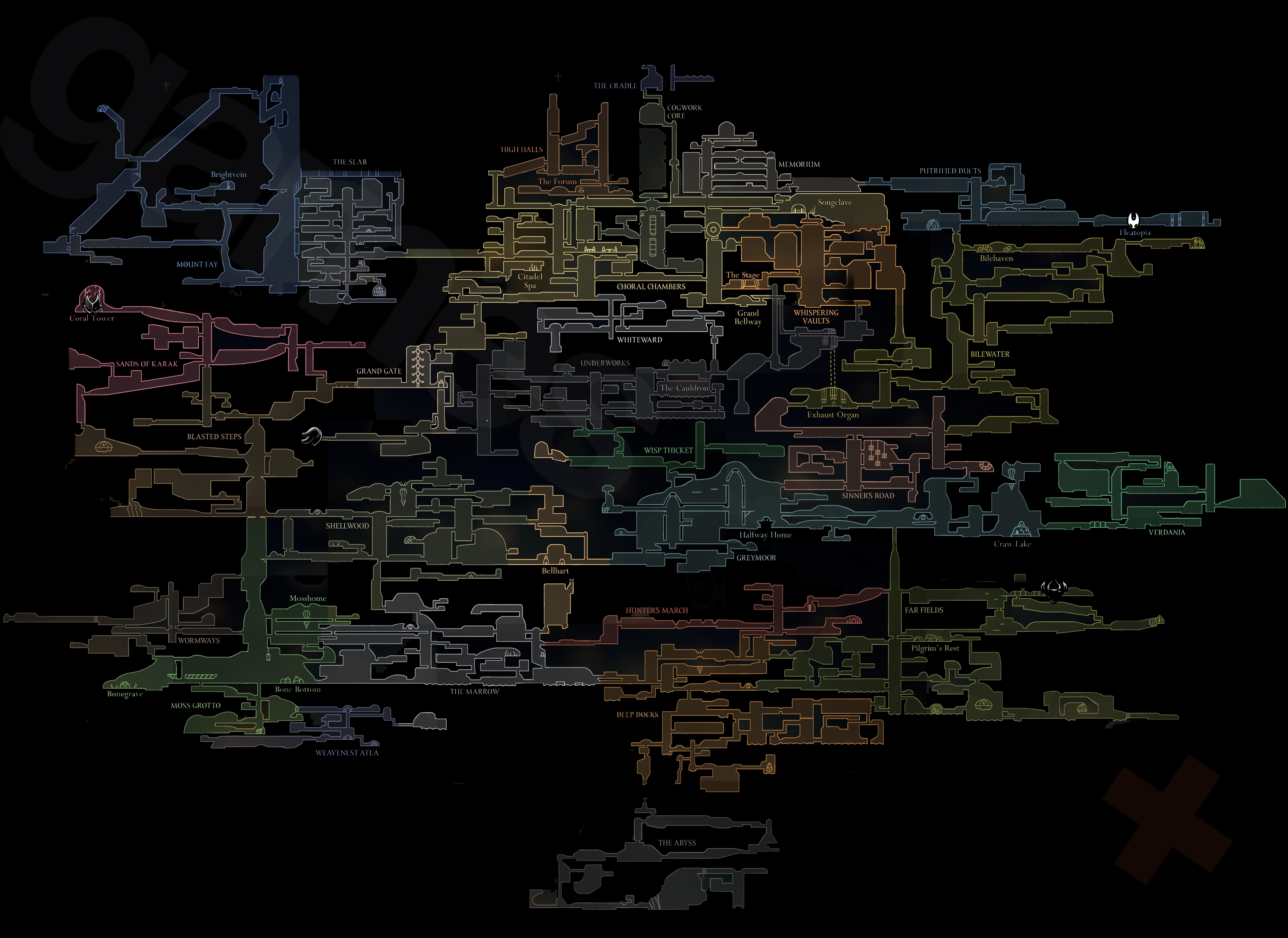 Now, it's possible that there are a few tiny nooks and crannies still to be revealed (Silksong is a game that loves hidden, secret passages), but if not the full map laid out above, this is definitely at least 99% of it. Keep in mind though that the mere existence of a path or passage doesn't guarantee you'll be able to use it yet, it may require a key, abilities you don't have, a certain amount of story progression, or to be approached from the other side.
