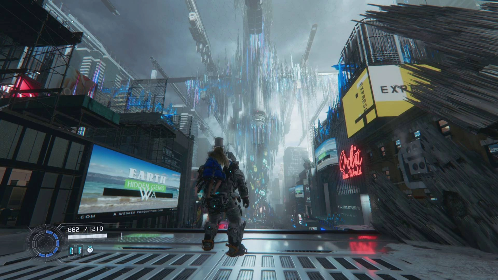 There are lots of Pragmata Mass Produciton Array collectibles to find, many of which you won't be able to get until you know how to destroy blue crystal-like misprints that block certain paths. It's well worth backtracking through this New York-themed level too, as you can get lots of useful Cabin Coins and Pure Lunum that will help early on, as well as some excellent Mods that will serve you well for the rest of Pragmata.