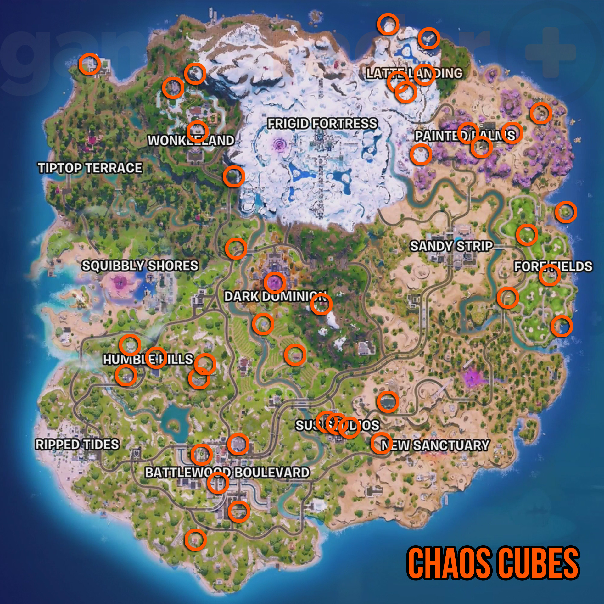 At the time of writing there are a total of 40 Chaos Cubes in Fortnite, which can be found in the locations marked above. These are divided into sets of five in each of the following POIs:
