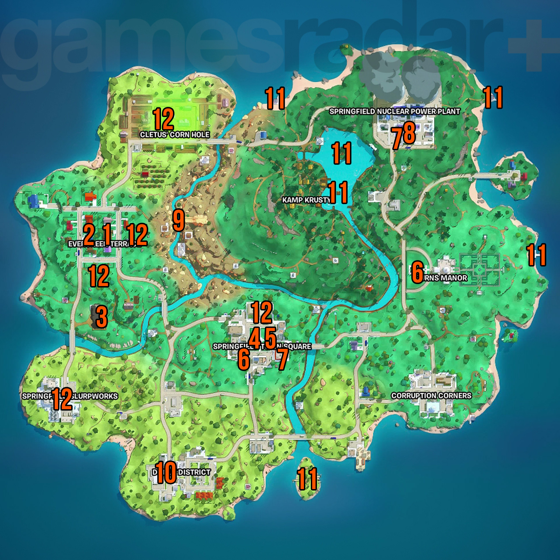 There are a total of 12 Fortnite Hidden Gags locations spread across Springfield, which I've marked on the map above. Note that some of the Hidden Gags can be completed in more than one location, while others rely on certain characters or items being spawned at random, meaning not all of these markers are guaranteed in every match.