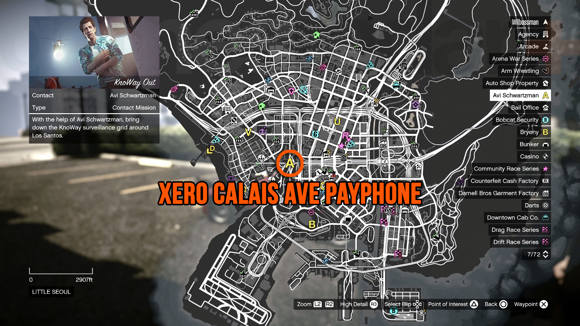 To respond to the mysterious text message you've received, you need to get to the payphone at the Xero gas station on Calais Avenue. If you don't know where that is in GTA Online then don't stress, as it actually gets marked on your map. We've highlighted the location above, which is indicated by an A icon for Avi Schwartzman, the hacker you may have worked with on previous heists who is trying to bring down KnoWay's surveillance grid in Los Santos.