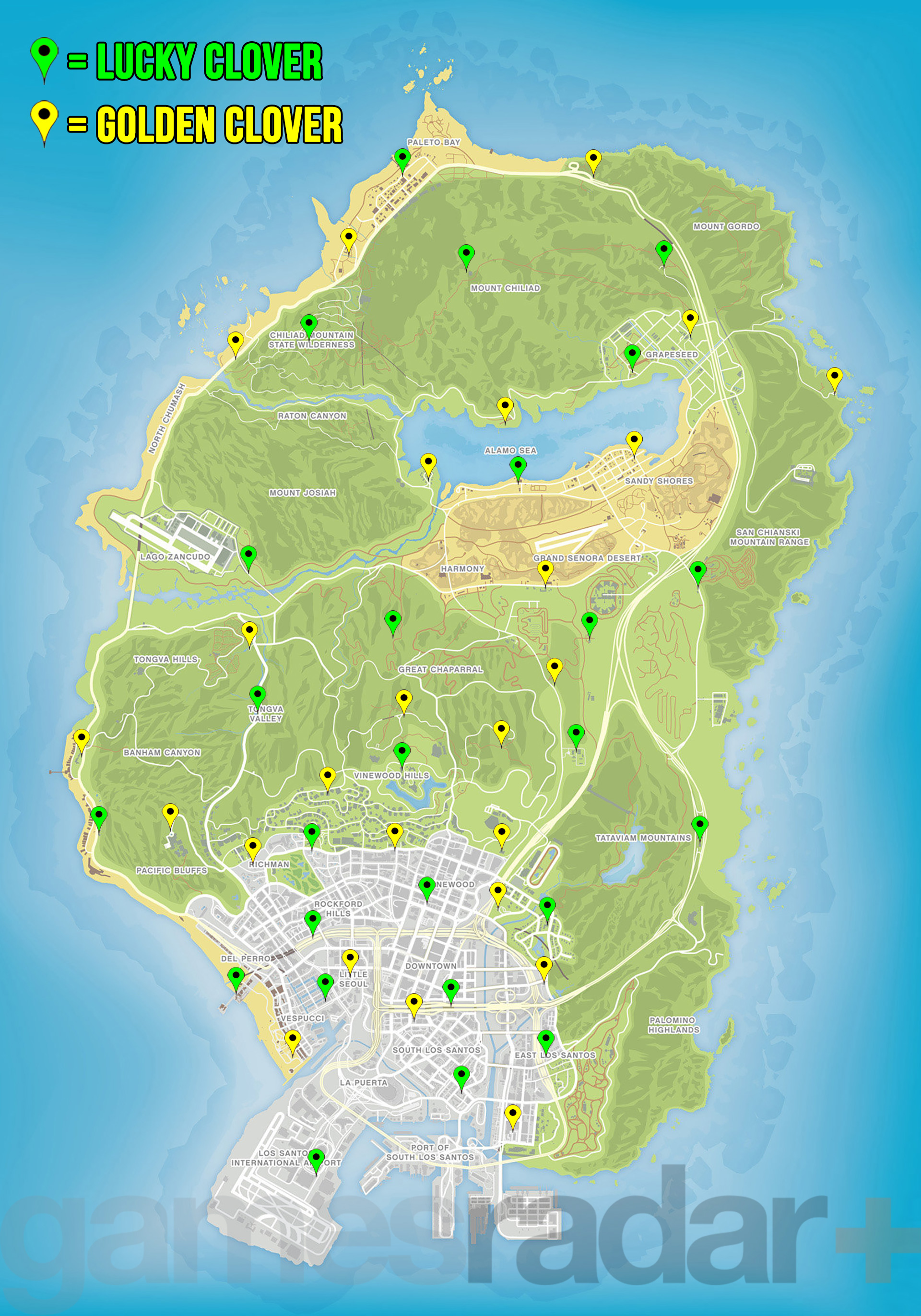 I've marked all 25 GTA Online Lucky Clover locations on the map above in green, which will always be found in those positions. As explained earlier, I've also tagged all 25 possible GTA Online Golden Clover locations, though only one of these will be active during each in-game day from midday to midday, before the spawn moves to a different position – this is randomized for each player so the only way to find it is to keep trying different locations until you spot it.