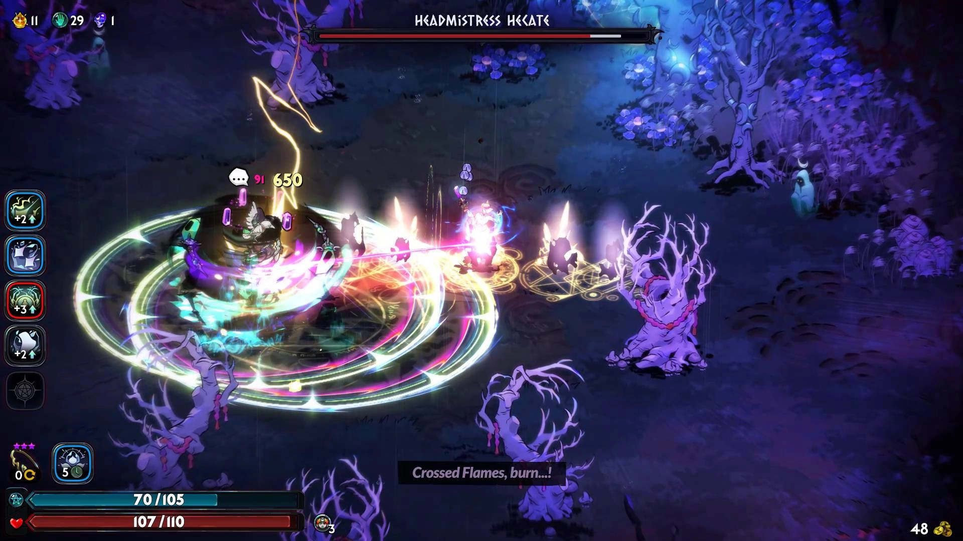 - Aspect of Selene: You start with runs with a unique Hex called Sky Fall. This Hex fires several beams of moonlight from above near Melinoe's position, potentially dealing damage to multiple foes and applying Shine (afflicted foes take 50% more damage from Omega Moves for 8 seconds). At Rank 1, Sky Fall is ready after 100 Magick has been spent but this comes down to 60 at Rank 5.
