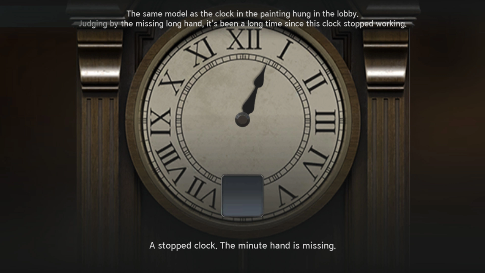 When you arrive in the Mansion Lobby for the first time and can start interacting with the various objects found there, one of them will be a timepiece on the wall that reveals the Resident Evil Survival Unit clock puzzle. You're told that this clock is missing its minute hand and has likely been stopped for a long time, while also referencing that it is the same model as the clock in the painting hanging in the lobby. That's quite a big clue, though it's easy to overlook the painting as part of the background scenery.