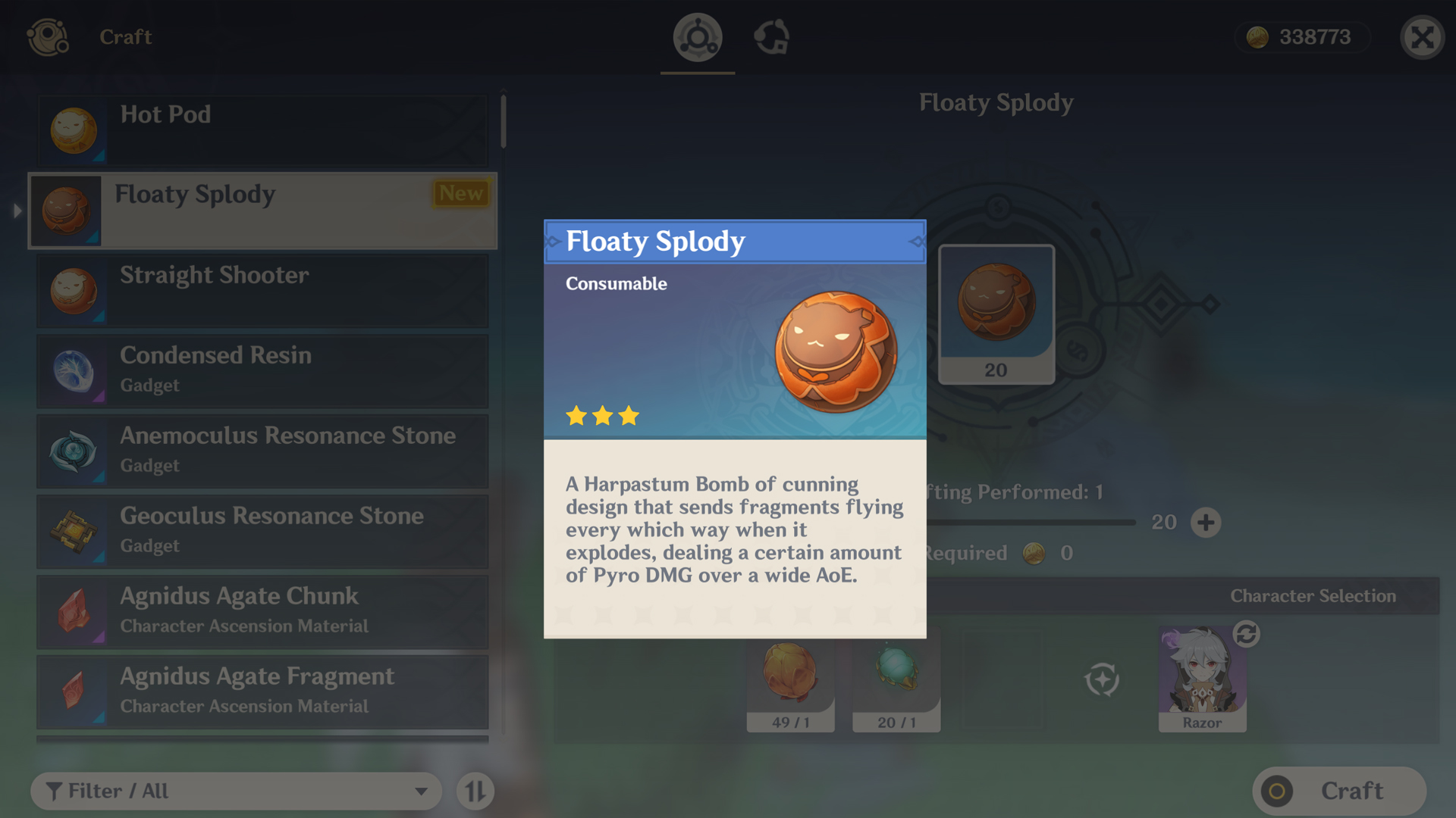 - Floaty Splody. Deals explosive Pyro damage over a large area-of-effect. Floaty Splody can be crafted with a Flaming Flower Stamen and a Luminescent Spine.