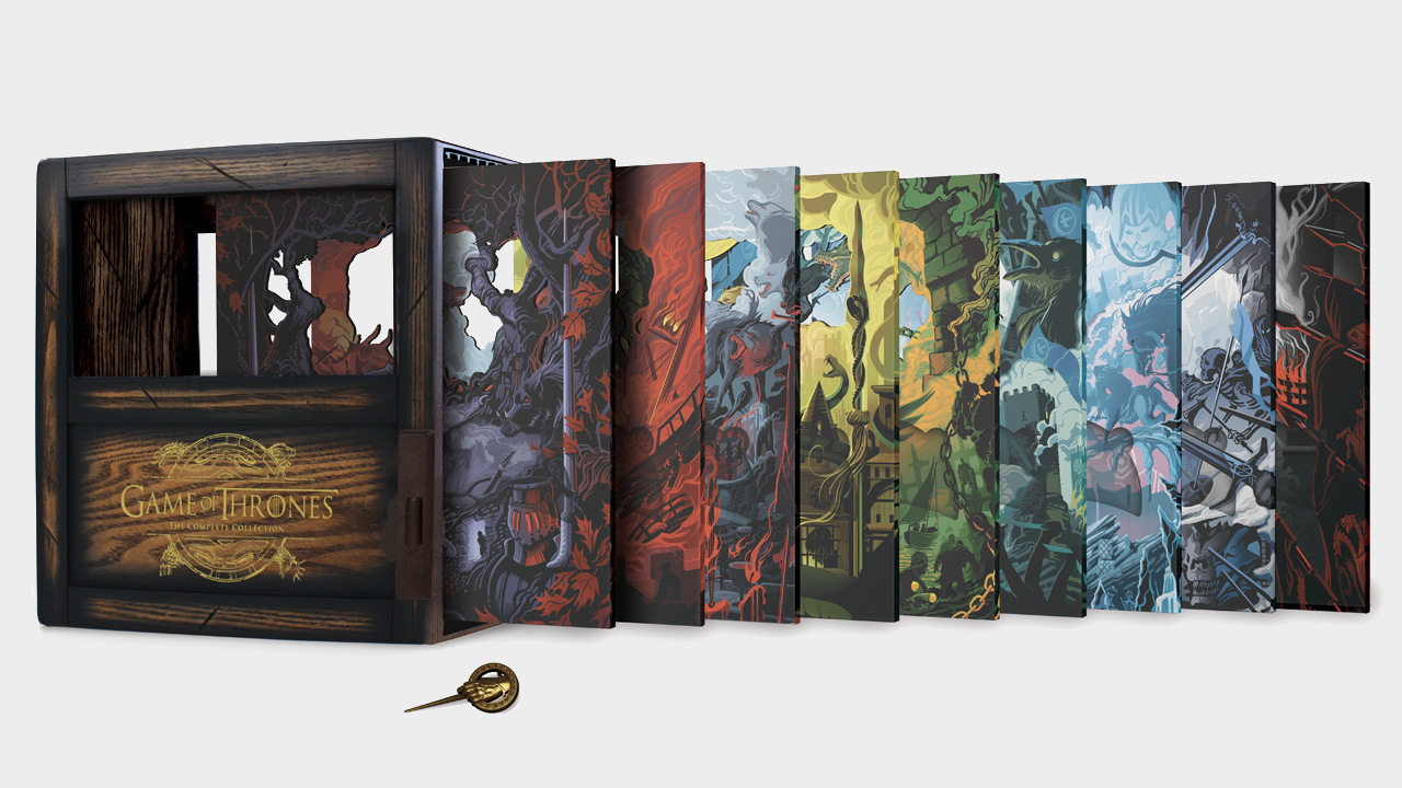 The Collector's Edition get's you: all the series on disc; the Game of Thrones: Reunion Special - a two-part, live-audience get together show with loads of the cast; an outrageously excellent wooden shadow box case, featuring a multi-layer panel design that summarize the story in beautiful snapshots; and a Hand of the King pin clasp which can hold all the special disc cases. Nice. The more-straightforward Complete DVD edition still bags you lots of extra content but with none of the really flashy and unique design. Still, great value to be had on both if you're after something special to celebrate the series with, and something that's physical not an intangible digital or streamy copy.