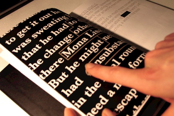 It's a book that uses electronically conductive ink to detect when its print is being touched, and then tells a PC via Bluetooth. The designer, Manolis Kelaidis, recently showed how pressing on a word in a blueBook can bring up the dictionary definition of that word on a wireless laptop.