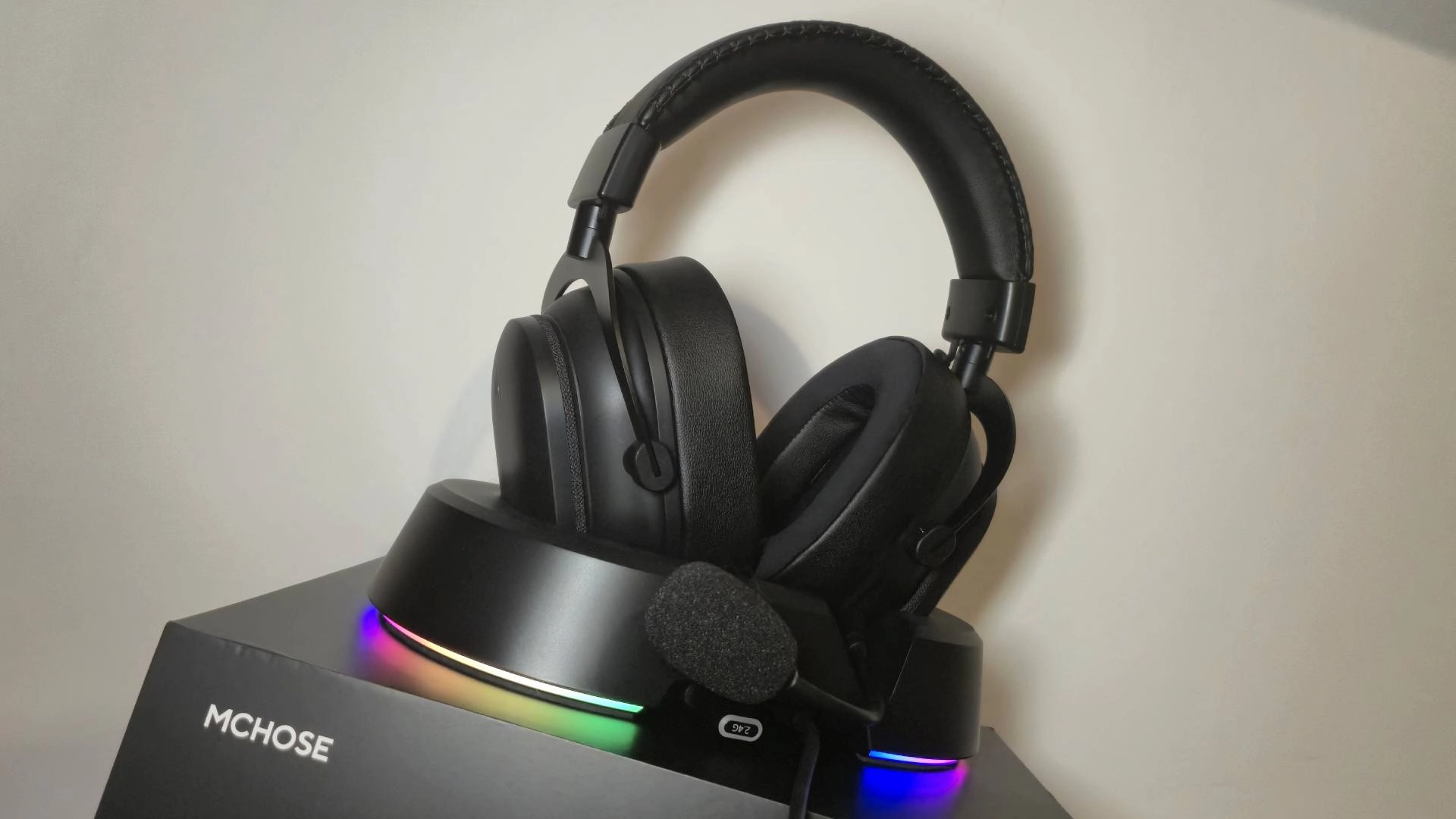 Mchose's version is at least a bit flashier, as it's rocking a rim of RGB lighting around the bottom. It's also a lot larger than the Scape's version, but this makes it easier to drop down and magnetically lock in the headset when you need to give it more juice. It's not just built for charging either as it also doubles up as a wireless transmitter.