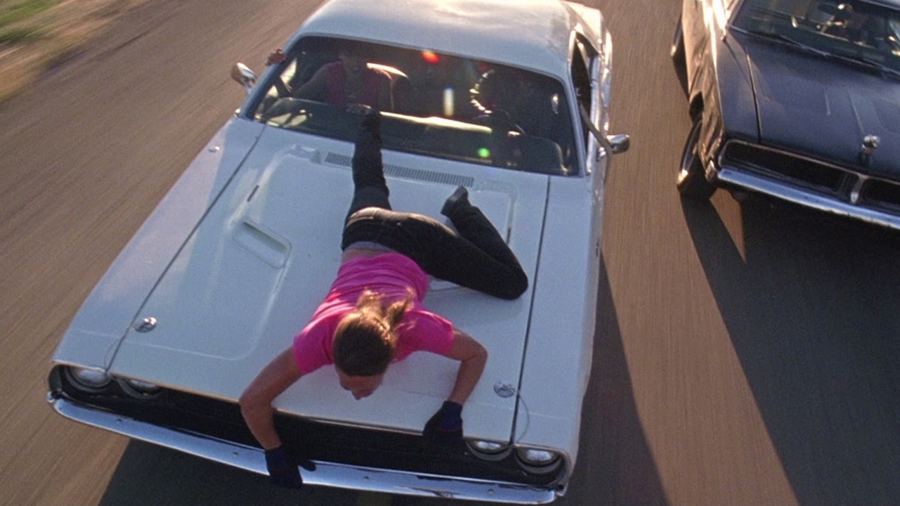 The stunt: The girls take a Dodge Challenger for a spin, and their seemingly innocent ride turns into an incredibly dangerous game called Ship's Mast. This involves Zoe - stuntwoman Zoe Bell playing herself! - lying across the bonnet of the car, holding onto two seatbelts while the Dodge is being driven at 85 mph. She did the whole stunt herself.