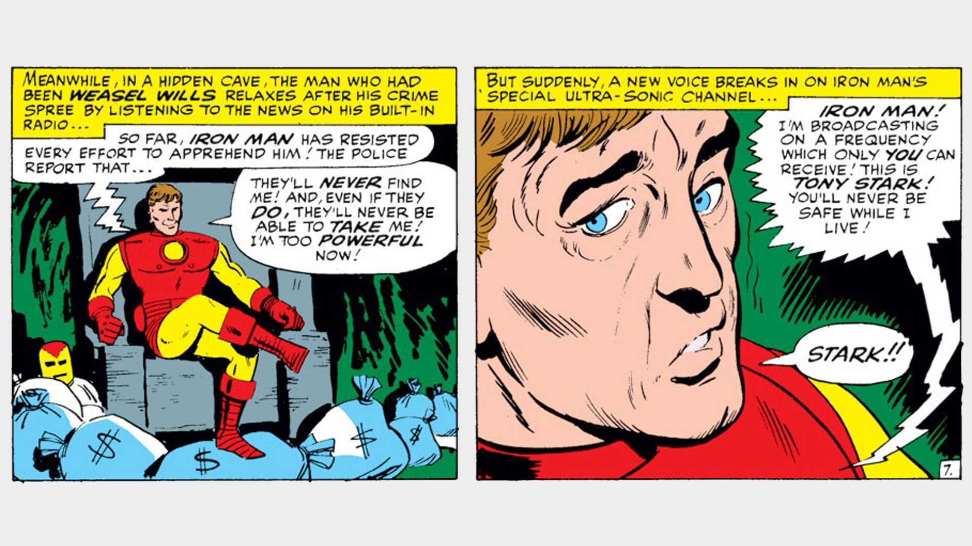 Way back in Tales of Suspense #65 (collected in Captain America Epic Collection: Captain America Lives Again), Weasel Wills was a two-bit criminal who decided to strike it rich by stealing from Stark Industries, wherein he found Tony Stark's attache case containing his portable Iron Man armor.