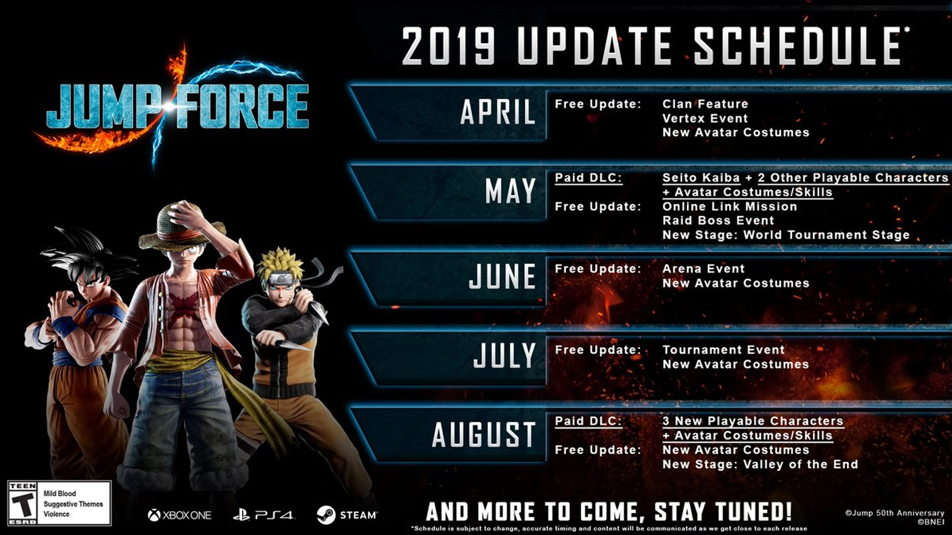 Bandai Namco revealed a Jump Force roadmap on Twitter which outlines all the scheduled content we can expect from April right through to August, and happily we’re going to get a lot of free updates.