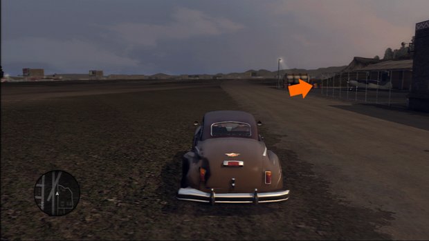 Keep an eye out to the right, and you'll see a fenced in yard with a plane just before the road intersects with the runways. Head in there.