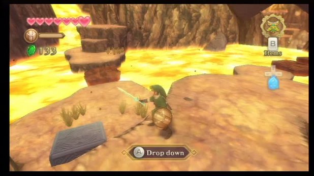 When you enter the central cave after bombing the lava plug, drop down off the edge of the entrance platform for the long drop down. While falling, direct yourself towards the Goddess Cube that is sitting on top of a pillar. Land on it and give it a whack.