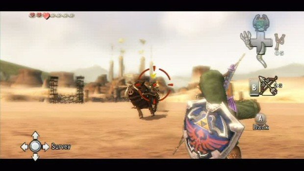 Once you have brought the bridge piece to the Eldin Bridge, teleport back to Gerudo Mesa and head to the north until a scene plays and two boars attack. Use the bow to take down the riders and then commandeer one of the boars to ride. Go towards the gates and use dash to crash through them. Enter the next area and clear out the huge swarm of enemies inside. Continue to the Northwest corner where there is a roast and find the silver key there. Go through the gate you passed on your way and you will now need to fight a rather large enemy with an even larger hammer. Wait for him to swing and dodge and then attack him with slashes. Once you have hit him enough, he will run away and set the building on fire. Hop on the boar and crash through the gate and you will then reach the entrance to the Arbiter Grounds.