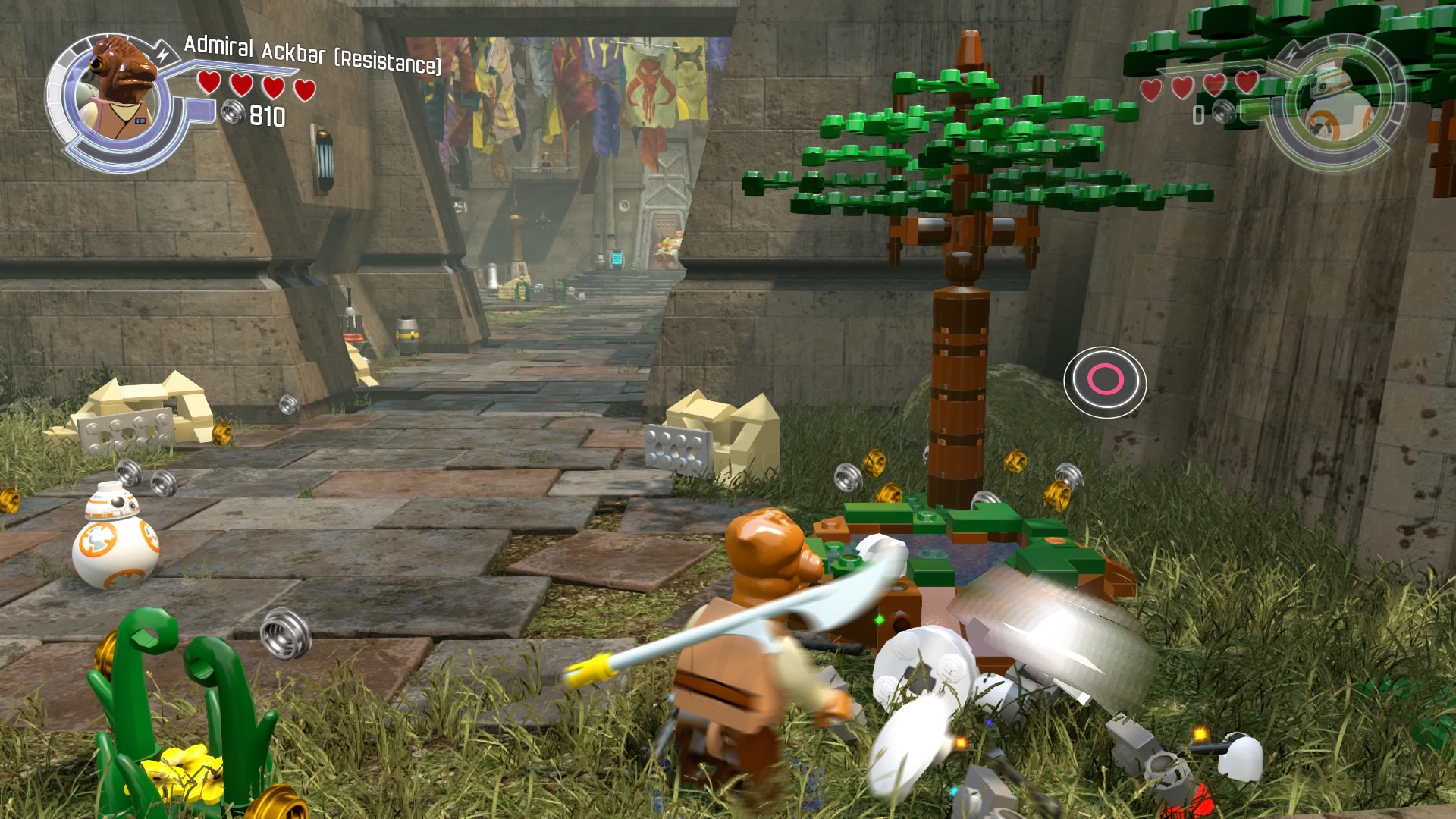 Build the contraption over on the left and use BB-8 to interact with the port. This will rip out the tree so you can access the stud wall.