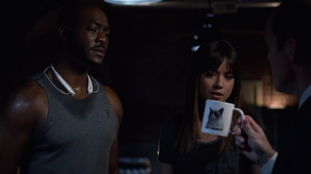 Everything changes, but not usually quite so rapidly as in “A Fractured House”. By the end of this episode Ward is free, SHIELD is publicly vindicated, Talbot is ready to shake and make up (with a broken arm – does that make it more or less genuine?) and Coulson discovers a Grumpy Cat mug in the SHIELD kitchen.