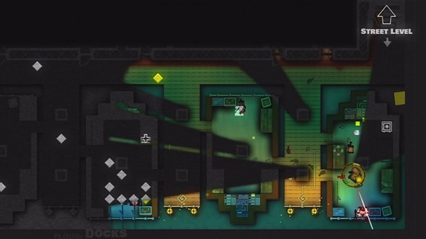 Now that you are on sea level, use the computer and work your way past the lasers, ignoring the coins for now. When you reach the bottom, pop the safe in the engine room and then use the light bulb to turn off the power. Run north collecting the coins and then go up the ladder on the left to the docks. Make your way past the next set of lasers and go through the door on the left at the bottom. Move past the beams there and go up the ladder to the Street Level. Take out the two guards there and collect the coins here. Go up the narrow passage on the left side and grab the coins and stack of bills while avoiding the spinning lasers. Go through the passage on the right and follow it up to the stairs and you should have all the coins collected for the street level now.