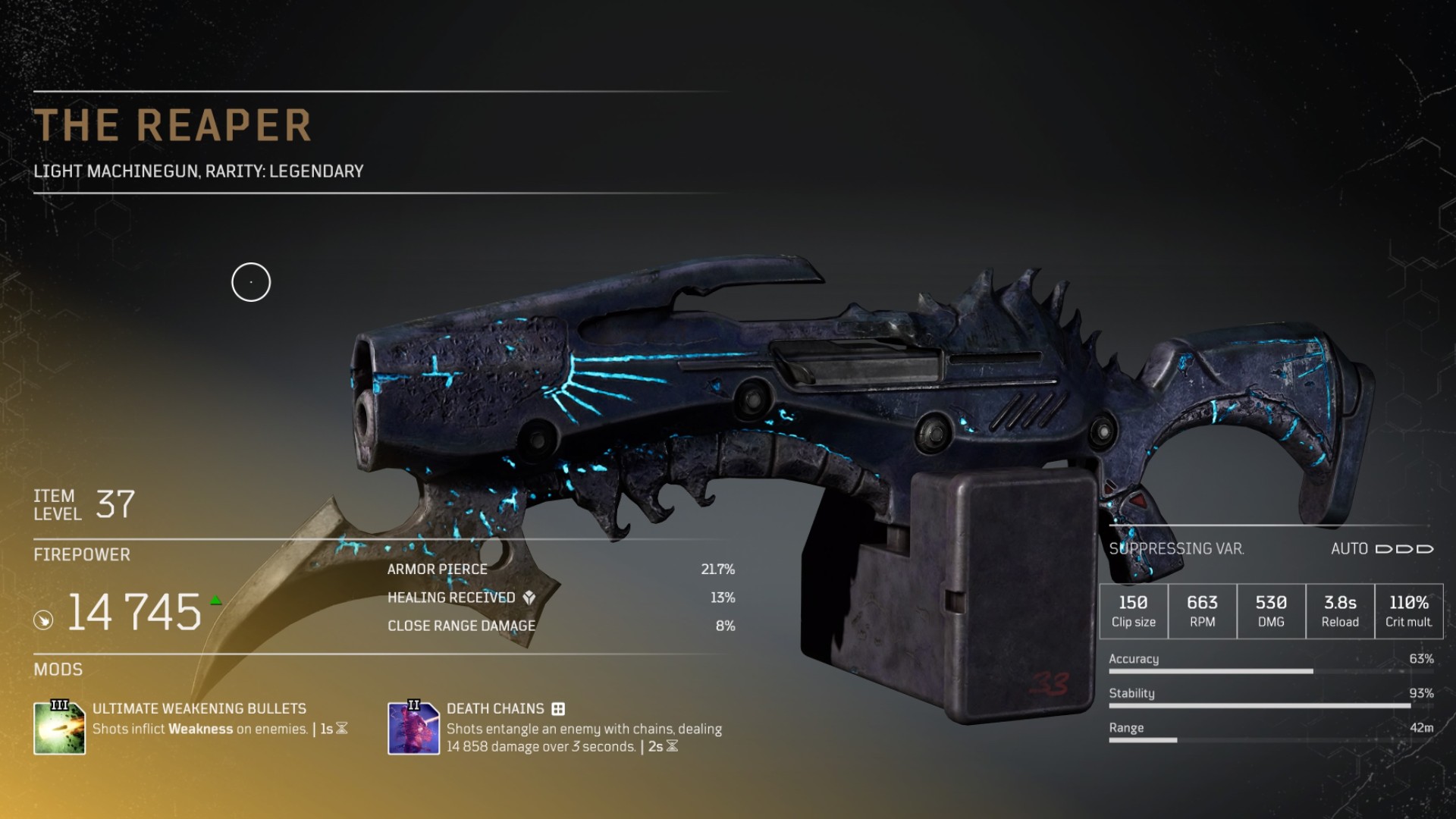 Another legendary LMG that is generally just quite good, The Reaper makes sure practically every other bullet you fire will inflict weakness on enemies. Death Chains is also one of the top weapon mods in the game for general damage, especially on fast-firing guns.