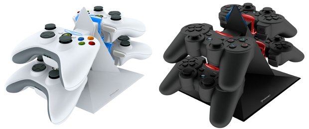 True, it’s a bulky device – there has to be a more efficient way of storing four controllers. And the five LEDs – a blue one in the center and another in each socket, which glows red while charging and blue when complete – are bright enough to distract you if they’re within your field of vision. But for me at least, the simple convenience of having two fully charged PS3 and 360 controllers always ready blows away the quibbles and makes the Power Pyramid a must-have. When my pyramid got broken by club-fisted burglars, I bought another one immediately. It’s one of those things you might not realize you want until you have it, then you can’t imagine being without it. Get one.