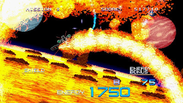 This is about as far 3D came when it wasn't made of polygons. Everything is made up of scaling sprites as you pilot your ship through asteroid fields, lava-filled caverns, and beautiful cloudscapes. Gameplay-wise, it's a lot like After Burner, only slightly slower and with more control over where you can fly. It's still essentially on-rails, but you do get some route options and there are obstacles to avoid, which After Burner doesn't really have (canyon walls notwithstanding).